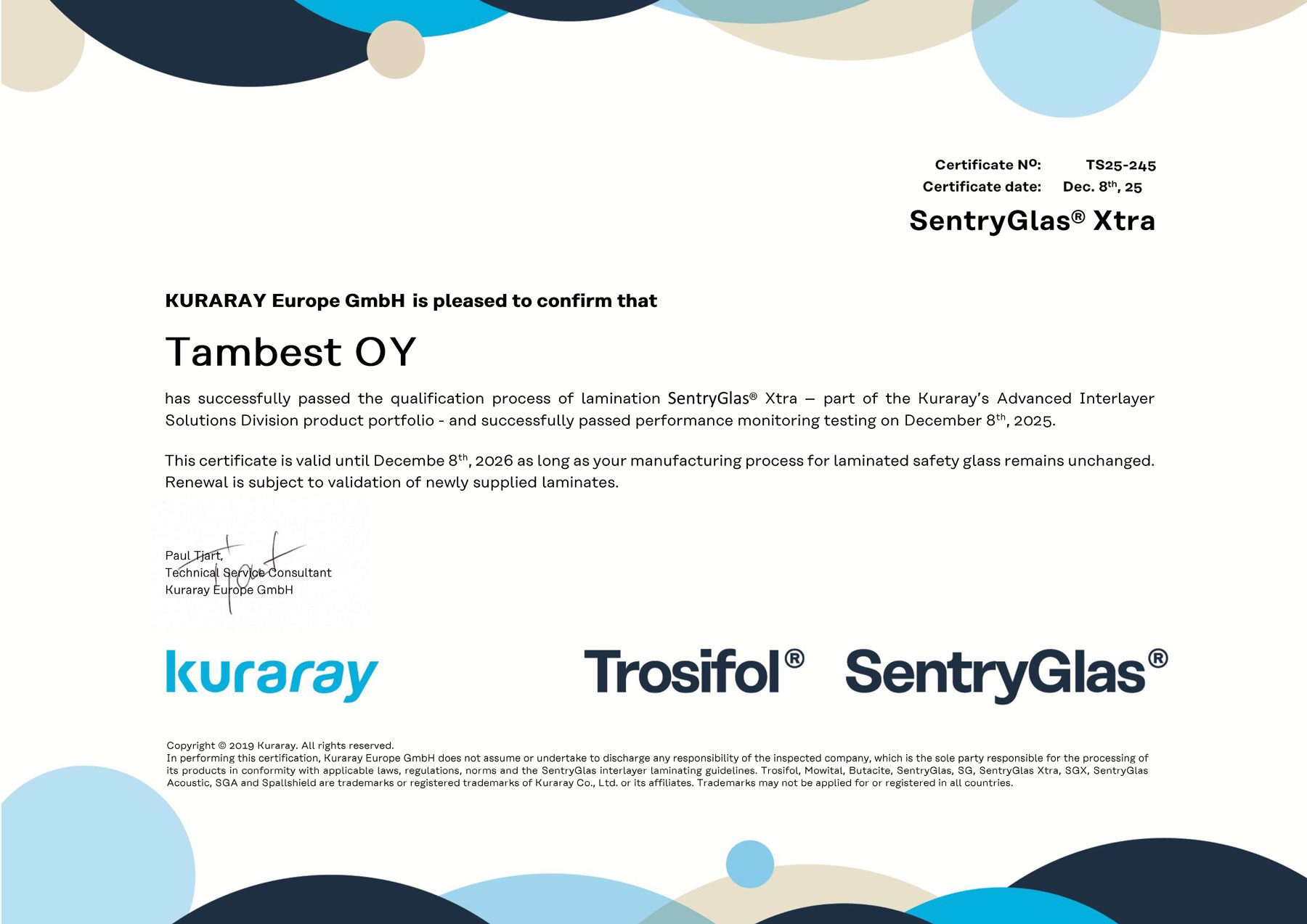 Tambest Oy on sertifioitu SentryGlas® laminoitujen lasien valmistaja – konekantamme ja osaamisemme mahdollistavat haasteellisetkin lasirakenteet.